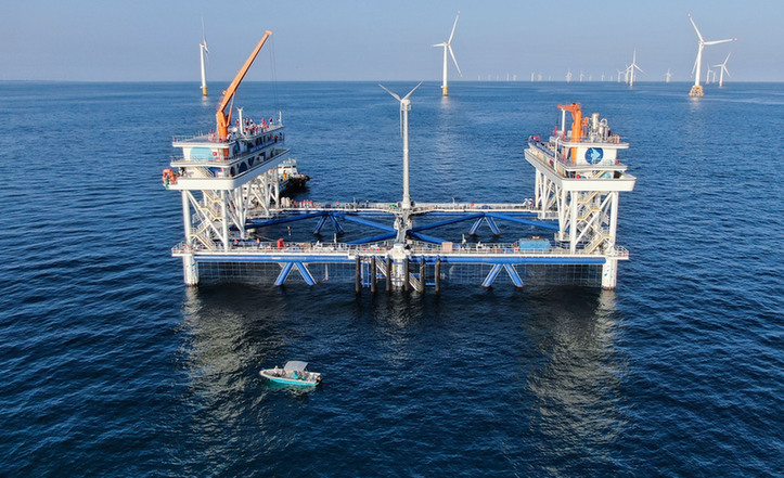 这是在广东汕尾拍摄的中广核“伏羲一号”风渔融合网箱平台(无人机照片)。新华社记者邓华摄